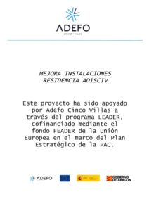 El proyecto Mejora en Instalaciones de la Residencia de Adisciv, llevado a cabo en este año 2025, ha recibido una ayuda de 4.682.33 € lo que ha supuesto una financiación del 73,13 % del coste total y por parte de ADEFO CINCO VILLAS y las ayudad LEADER ( Fondo FEADER ) y con el cual se han llevado a cabo una serie de mejoras en la Residencia de la entidad, como han sido la adquisición de nuevas taquillas para el personal, la adquisición de sofás y la instalación de sistema de llamadores para la asistencia de los usuarios de este servicio. Gracias a este proyecto se ha conseguido tal y como se propuso en el proyecto una mejor calidad en la atención y bienestar de los usuarios y personal a través de estos nuevos equipamientos.