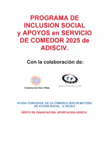 Este proyecto , presentado a la convocatoria de ayudas de acción social de la Comarca de Cinco Villas en el ejercicio 2025 , y en el cual los usuarios de la entidad a través de sus apoyos han podido realizar actividades de inclusión en la comunidad ( salidas a actividades culturales, actividades especificas de sevillanas o danzaterapia entre otras , actividades con voluntariado del hogar de mayores de Ejea, participación en actos festivos… ) y así mismo aquellos usuarios que hacen uso de los servicios de comedor en atención de día, recibir el apoyo necesario en este servicio. Agradecer de nuevo a la Comarca de Cinco Villas el apoyo a la entidad ADISCIV, en este caso a este proyecto que sin duda mejora la calidad de vida de las personas con discapacidad intelectual y sus familias.